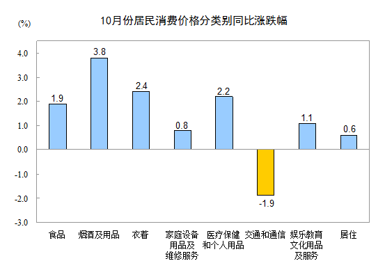 10月份,非食品價格同比上漲0.9%。其中,煙酒及用品、衣著、醫(yī)療保健和個人用品、娛樂教育文化用品及服務、家庭設備用品及維修服務、居住價格分別上漲3.8%、2.4%、2.2%、1.1%、0.8%和0.6%;交通和通信價格下降1.9%。