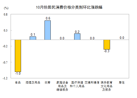 10月份,全國居民消費價格總水平環(huán)比下降0.3%。其中,城市下降0.3%,農(nóng)村下降0.3%;食品價格下降1.0%,非食品價格上漲0.1%;消費品價格下降0.4%,服務價格下降0.1%。