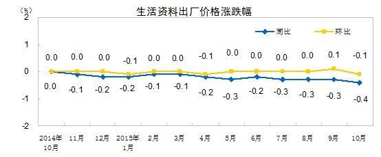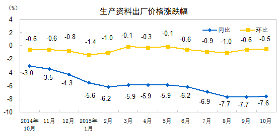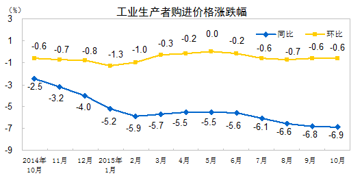 2015年10月份,全國工業(yè)生產(chǎn)者出廠價格環(huán)比下降0.4%,同比下降5.9%。工業(yè)生產(chǎn)者購進價格環(huán)比下降0.6%,同比下降6.9%。1-10月平均,工業(yè)生產(chǎn)者出廠價格同比下降5.1%,工業(yè)生產(chǎn)者購進價格同比下降6.0%。