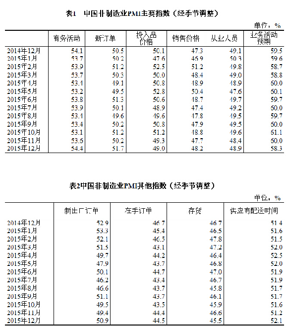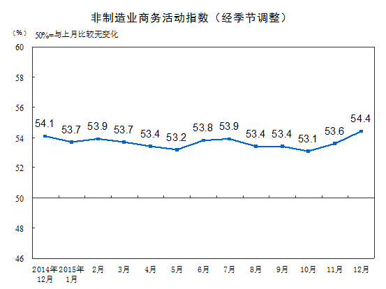 2015年12月份,中國非制造業(yè)商務(wù)活動指數(shù)為54.4%,比上月上升0.8個百分點(diǎn),升至2015年內(nèi)高點(diǎn),擴(kuò)張動力較為強(qiáng)勁。