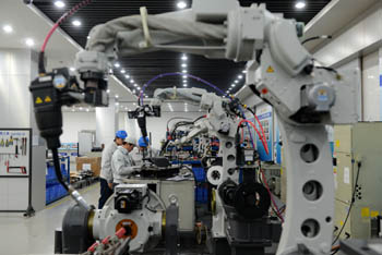 ??? 河北省唐山市機(jī)器人產(chǎn)業(yè)基地是“國(guó)家火炬計(jì)劃特色產(chǎn)業(yè)基地”?;丶瘷C(jī)器人本體研發(fā)、生產(chǎn)、銷售、技術(shù)服務(wù)為一體,2015年基地內(nèi)核心企業(yè)實(shí)現(xiàn)產(chǎn)值36.8億元。圖為唐山松下產(chǎn)業(yè)機(jī)器有限公司工作人員在對(duì)焊接機(jī)器人進(jìn)行測(cè)試。記者 牟宇 攝