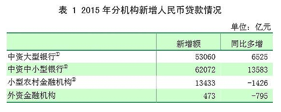2015年末,金融機(jī)構(gòu)本外幣貸款余額為99.3萬億元,同比增長13.4%,與上年末基本持平,比年初增加11.7萬億元,同比多增1.3萬億元。人民幣貸款余額為94.0萬億元,同比增長 14.3%,比上年末高0.6個(gè)百分點(diǎn),比年初增加11.7萬億元,同比多增1.8萬億元。從人民幣貸款部門分布來看,住戶貸款、非金融企業(yè)及機(jī)關(guān)團(tuán)體貸款增長略有加快,非銀行業(yè)金融機(jī)構(gòu)貸款增多。2015年末,住戶貸款余額為27.0萬億元,同比增長 16.8%,增速比上年末高0.2個(gè)百分點(diǎn),比年初增加3.9萬億元,同比多增5814億元。其中,個(gè)人住房貸款比年初增加2.5萬億元,同比多增9250億元。非金融企業(yè)及機(jī)關(guān)團(tuán)體貸款余額為65.8萬億元,同比增長12.7%,增速比上年末高0.2個(gè)百分點(diǎn),比年初增加7.4萬億元,同比多增8987億元。非銀行業(yè)金融機(jī)構(gòu)貸款余額為8539億元,同比增長 66.9%,比年初增加3767億元,同比多增2605億元。從期限看,中長期貸款比年初增加6.7萬億元,同比多增6332億元,增量占比為57.1%。包含票據(jù)融資在內(nèi)的短期貸款比年初增加4.7萬億元,同比多增1.2萬億元;其中,票據(jù)融資比年初增加1.7萬億元,同比多增7062億元。分機(jī)構(gòu)看,中資大型銀行和中資中小型銀行貸款同比多增較多。