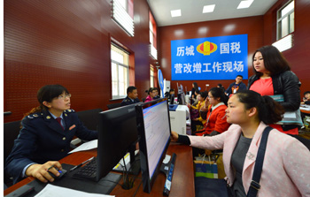 4月12日,濟(jì)南市歷城區(qū)國稅局工作人員為納稅人進(jìn)行“營改增”稅控裝置發(fā)行和增值稅發(fā)票發(fā)放工作。 新華社記者 郭緒雷/攝? |