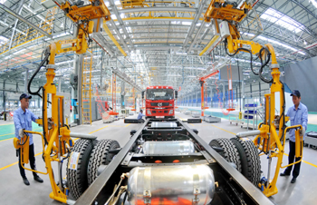 工人在中航工業(yè)(邢臺)卡車總裝車間內(nèi)工作(5月11日攝)。 新華社記者 朱旭東/攝? |