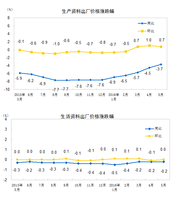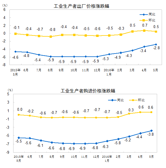 2016年5月份,全國(guó)工業(yè)生產(chǎn)者出廠價(jià)格環(huán)比上漲0.5%,同比下降2.8%。工業(yè)生產(chǎn)者購(gòu)進(jìn)價(jià)格環(huán)比上漲0.6%,同比下降3.8%。1-5月平均,工業(yè)生產(chǎn)者出廠價(jià)格同比下降4.1%,工業(yè)生產(chǎn)者購(gòu)進(jìn)價(jià)格同比下降5.1%。