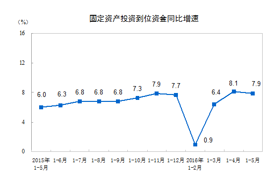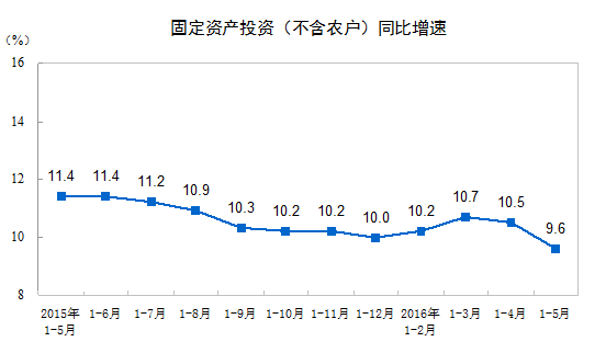 ? 2016年1-5月份,全國固定資產(chǎn)投資(不含農(nóng)戶)187671億元,同比名義增長9.6%,增速比1-4月份回落0.9個百分點(diǎn)。從環(huán)比速度看,5月份固定資產(chǎn)投資(不含農(nóng)戶)增長0.49%。