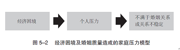 在現(xiàn)存的理論之中,艾奧瓦州立大學社會與行為研究所的蘭特?康格及其同事為我們提供的理論,用簡單易懂的方式極為有效地解釋了經濟條件與婚姻狀況之間的聯(lián)系。他們提出的有關經濟困境造成家庭壓力的模型包括三個基本組成部分:(1)經濟困境使得基本需求(比如食物和住宿)難以得到滿足;(2)婚姻雙方都背負了個人的壓力;(3)當雙方溝通時,會在感情中出現(xiàn)更多的負面行為,雙方對婚姻關系整體質量的看法也會更加消極。