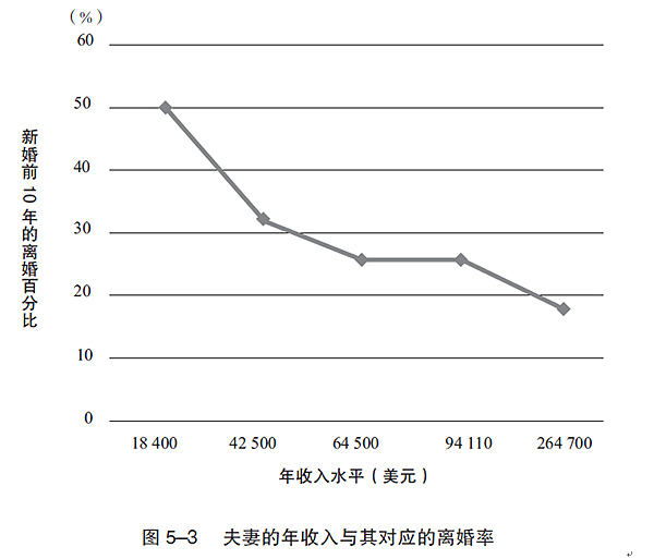 從有關財富和戀愛穩(wěn)定性的研究中我們可以清楚地看出,經濟困境對于一段感情的正常運轉起著至關重要的作用。2010 年的《離婚與再婚》雜志上發(fā)表了一項對30 000 多名女性展開的縱向追蹤研究,結果表明,在新婚的前10 年間,與位于最高年收入前5% (264 700 美元)的家庭相比,年收入位于最后5% 的家庭(18 400 美元)的離婚率要高出2.8 倍。貧困線(23 500 美元)位于收入最低的五分位數(shù)與下一個五分位數(shù)的交界點,一旦越過這個點,離婚率便出現(xiàn)了17% 的驟減,這也是離婚率下跌的最大幅度。當收入超過中等收入水平(64 500 美元)后,離婚率也隨之出現(xiàn)了輕微的下降,但幅度卻比收入越過貧困線后出現(xiàn)的大幅驟降要小許多。