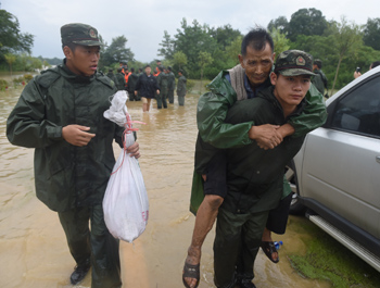 7月4日,武警安徽省總隊(duì)第一支隊(duì)二大隊(duì)官兵在轉(zhuǎn)移桐城市雙港鎮(zhèn)村民。 新華社記者 郭晨/攝? |