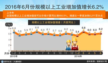 受穩(wěn)增長(zhǎng)政策、企業(yè)效益改善等因素影響,今年以來工業(yè)生產(chǎn)改變了過去增速持續(xù)放緩態(tài)勢(shì),出現(xiàn)一定企穩(wěn)跡象。國(guó)家統(tǒng)計(jì)局?jǐn)?shù)據(jù)顯示,上半年,全國(guó)規(guī)模以上工業(yè)增加值同比增長(zhǎng)6%,增速與上年基本持平。從近四個(gè)季度增長(zhǎng)情況看,2015年三、四季度工業(yè)生產(chǎn)增速均為5.9%,今年一、二季度分別增長(zhǎng)5.8%和6.1%,連續(xù)四個(gè)季度保持在6%左右的區(qū)間內(nèi)小幅波動(dòng),終止了工業(yè)增速連續(xù)下滑的趨勢(shì)。