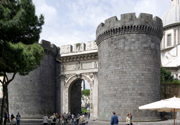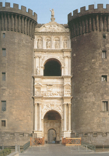 阿方索大王的兒子費爾南特(Fernante, 1458年-1494年在位)和孫子阿方索二世(Alfonso II, 1494年-1495年在位)繼承其衣缽,繼續(xù)推行文化資助政策。在15世紀(jì)中后期費爾迪南多一世在位期間,那不勒斯的人口增長迅速,老城日益擁擠,于是費爾迪南多下令修建新城墻。新城墻的城門大多采用了文藝復(fù)興風(fēng)格,其中最著名的是卡普亞納城門(Porta Capuana)。這座城門很像阿方索大王凱旋門的縮小版,同樣是兩個圓柱碉堡拱衛(wèi)著一個古典化風(fēng)格的凱旋門(圖3)。