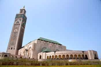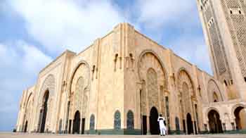 而在卡薩布蘭卡,有一座清真寺舉世聞名,那就是全世界現(xiàn)代化程度最高以及世界第三大的清真寺哈桑二世清真寺。遠(yuǎn)遠(yuǎn)看去,它似乎像一座漂浮在海上的清真寺,因?yàn)槠渲杏腥种坏拿娣e建在海上,以此來紀(jì)念摩洛哥的阿拉伯人祖先來自海上。而這個(gè)位置,也算得上伊斯蘭世界的最西端。