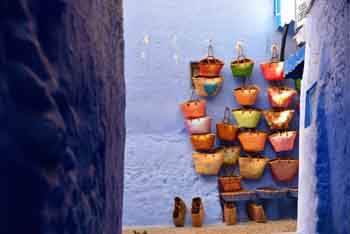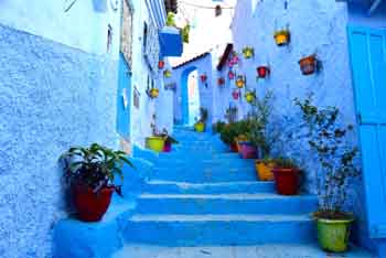 行走于舍夫沙萬,驚訝于這世間竟會(huì)有這樣的地方,將一種色彩演繹得如此淋漓盡致。屋頂、墻壁、樓梯、窗臺(tái)、甚至花盆,我目光能及的每個(gè)角落都被當(dāng)?shù)厝怂⒊闪怂{(lán)色。