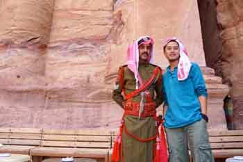 我在路邊小攤上買下了一塊具有阿拉伯風(fēng)格的頭巾,也被當(dāng)?shù)厝死嬌狭藷熝b,我想,就讓我做一天約旦人,去融入這玫瑰之城,去體味這千年的時光足印。