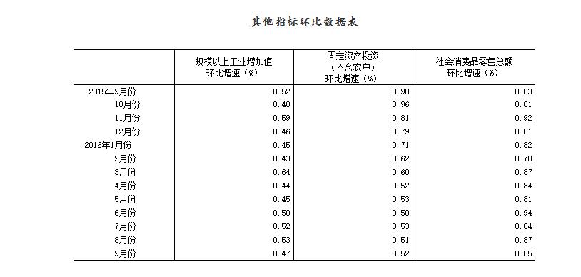?。?)根據(jù)季節(jié)調(diào)整模型自動(dòng)修正結(jié)果,對(duì)近一年來(lái)各期國(guó)內(nèi)生產(chǎn)總值、規(guī)模以上工業(yè)增加值、固定資產(chǎn)投資(不含農(nóng)戶(hù))、社會(huì)消費(fèi)品零售總額環(huán)比增速進(jìn)行修訂。修訂結(jié)果及2016年三季度GDP環(huán)比數(shù)據(jù)、2016年9月份其他指標(biāo)環(huán)比數(shù)據(jù)如下:
