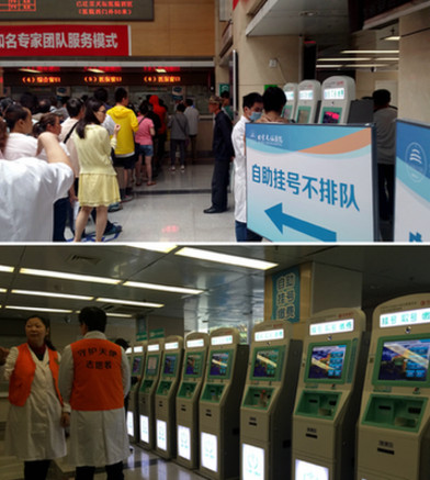 ?雖然醫(yī)院推出自助掛號機,但前來掛號的病人并不買賬。上圖:6月6日,天壇醫(yī)院排隊掛號的長隊?! ∠聢D:11月2日,天壇醫(yī)院自助掛號機鮮有人問津。記者 張晨霖/攝 |