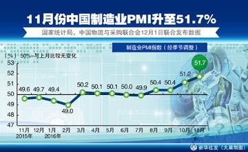 國家統(tǒng)計局服務(wù)業(yè)調(diào)查中心和中國物流與采購聯(lián)合會,12月1日發(fā)布中國采購經(jīng)理指數(shù)。數(shù)據(jù)顯示,11月,制造業(yè)PMI為51.7%,延續(xù)上行走勢,升至兩年來高點;中國非制造業(yè)商務(wù)活動指數(shù)為54.7%,連續(xù)三個月上升,為2014年7月以來的高點,繼續(xù)保持平穩(wěn)較快增長。