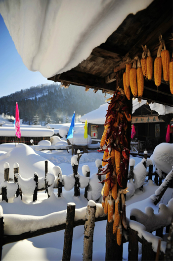 雪鄉(xiāng)的雪美得奇特,美得讓人不敢相信,真像童話故事和畫片中所描述的那樣,厚厚的白雪覆蓋的小村子連綿起伏,涌起像蘑菇一樣的座座小房子,在房頂和拌子垛上卷起一層層雪檐,她們就像剛長出來的一株株矮矮胖胖的“雪蘑菇”,慵懶而立。老房子外面的小院都是用木柵欄圍起來的,線條簡潔而不規(guī)范,如同炭筆畫漫不經(jīng)心的勾勒。當柵欄的木枝披上銀色外衣之后,則酷似一根根即將融化的奶油冰棍,與中間的“蛋糕”相映成趣。房頂、大地、山上隆起的雪堆和線條柔潤如棉絮,潔白像陶塑銀雕,在陽光映照下變幻萬千,韻味無窮。家家戶戶貼滿五顏六色的掛線春聯(lián),掛起串串紅燈,把那素雅的銀裝世界裝點映襯得更加美麗生動。