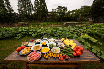 烏村恢復(fù)舊時農(nóng)家門前屋后有菜園的景象,大量的農(nóng)耕地種植了應(yīng)時的農(nóng)作物,在午餐時可品嘗烏村特色“一小時蔬菜”,菜肴從采摘到上菜僅需1小時,新鮮到無可挑剔。游玩時垂釣所得的野生塘魚還可在烏村廚房進(jìn)行烹飪。