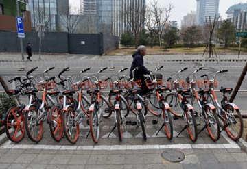 3月17日,在北京市石景山區(qū)銀河大街,共享單車整齊有序地停放在共享單車推薦停車點。 新華社記者 張晨霖 攝? |