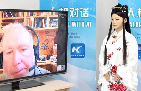 圖為當(dāng)日機器人佳佳通過網(wǎng)絡(luò)與科技觀察家凱文·凱利對話。新華社記者 郭晨/攝