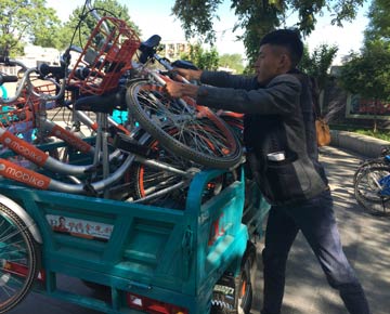 沒過多久,一輛載滿共享單車、用于調(diào)度的電動(dòng)三輪車駛來。車剛停穩(wěn),就被伸長手臂競相掃描二維碼開鎖的人們團(tuán)團(tuán)圍住。胡貴林緊忙上前一塊卸車。此后約40分鐘時(shí)間里,幾輛調(diào)度車周而復(fù)始跑了十多趟,每次都是滿載而來、空車離去。