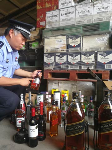 ?辦案人員在清點走私洋酒。記者 陸敏 攝 |