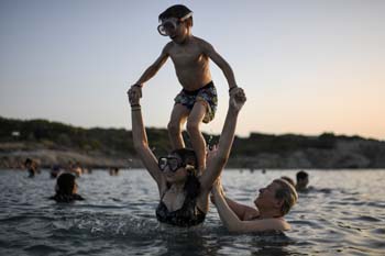 ??? 7月2日,在希臘雅典,人們?cè)诤K锛{涼。新華社/法新 |