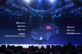 ??? 7月5日,百度AI開(kāi)發(fā)者大會(huì)在北京國(guó)家會(huì)議中心舉行,近5000名開(kāi)發(fā)者和生態(tài)合作伙伴參會(huì),百度在會(huì)上公布了完整的AI生態(tài)開(kāi)放戰(zhàn)略。圖為百度集團(tuán)總裁兼首席運(yùn)營(yíng)官陸奇發(fā)布百度Apollo開(kāi)放平臺(tái)。記者 申宏 攝 |