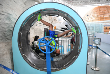 ??? 隨著暑假來臨,重慶科技館內(nèi)的科普演示裝置和互動項目吸引眾多孩子參觀體驗,孩子們在輕松愉快的氛圍中學(xué)習(xí)科學(xué)知識、體驗科學(xué)魅力。記者 王全超 攝 |