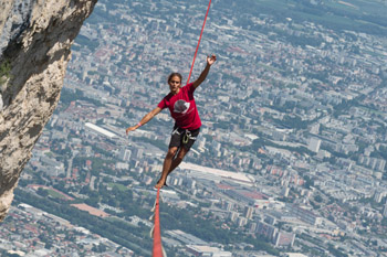??? 7月7日,在法國東部朗桑韋科爾的山峰間,一名男子在高空中走扁帶。扁帶運動是一項在懸空扁帶上行走并保持身體平衡完成各種技巧動作的新運動。其中高空扁帶是在高山、峽谷之間架起扁帶,采用自保護(hù)形式行走,不借助任何平衡工具的輔助,是扁帶運動中最為驚險刺激的一個項目,被譽(yù)為“天空芭蕾”。新華社/法新 |