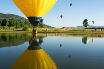 ??? 7月9日,在美國科羅拉多州的斯廷博特斯普林斯,一只參加比賽的熱氣球觸碰湖面。新華社/法新 |