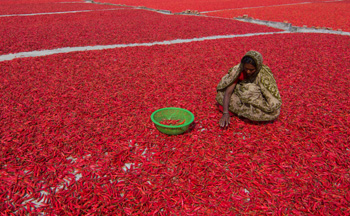 ??? 7月13日,在孟加拉國北部博格拉,當(dāng)?shù)剞r(nóng)民晾曬收獲的紅辣椒。新華社/西霸 |
