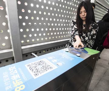 6月14日,乘客在武漢BRT武昌火車站刷支付寶進(jìn)站乘車。螞蟻金服數(shù)據(jù)顯示,武漢城區(qū)98%的出租車、超過80%的超市便利店、超過75%的餐飲門店、休閑娛樂等行業(yè)均支持移動支付。去年武漢市共有超過100萬人次,使用支付寶在醫(yī)院掛號、就診。?記者 肖藝九/攝 |