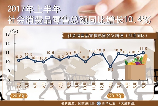 ????上半年,我國市場銷售增長加快,社會消費品零售總額172369億元,同比增長10.4%,增速比一季度加快0.4個百分點。其中,網(wǎng)上銷售增長強勁,同比增長33.4%,比一季度加快1.3個百分點。