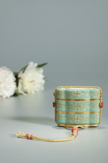 當(dāng)一件實用器,被賦予了越來越多的精神內(nèi)涵,便超越了“用”與“器”,成就了從實用器到陳設(shè)器的轉(zhuǎn)變。乾隆皇帝會把火鐮荷包,連同其他心愛的小文玩,一起放在多寶格或小柜中賞玩陳設(shè)。臺北故宮博物院藏品中可見,紫檀雕云龍紋小柜中,有黃緞彩繡福壽紋火鐮荷包一件;紫檀嵌彩瓷博古圖小柜中,有銀鍍金嵌松石珊瑚火鐮荷包一件……