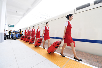 ??? 8月8日,在白城火車站,動車列車員列隊上車。當(dāng)日,長(長春)白(白城)烏(烏蘭浩特)鐵路正式開通運營。長白烏鐵路起自吉林省長春市,途徑吉林省松原市、大安市、白城市,止于內(nèi)蒙古自治區(qū)烏蘭浩特市,全長412公里,運營時速160公里,是內(nèi)蒙古自治區(qū)首條跨區(qū)域動車組列車運行線路。記者 張楠 攝 |