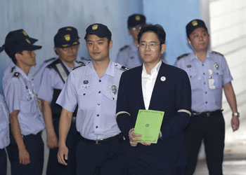 ??? 8月7日,在韓國首爾,三星電子副會長李在镕(前右)抵達首爾中央地方法院。就韓國三星電子副會長李在镕行賄前總統(tǒng)樸槿惠一案,檢察官7日建議首爾中央地方法院判處這名三星集團實際“掌門人”12年監(jiān)禁。新華社/美聯(lián) |