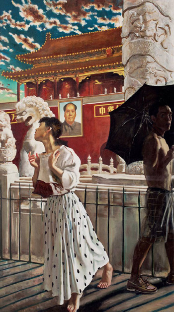 20世紀(jì)80年代至90年代早期,趙半狄從自己認(rèn)同的經(jīng)典藝術(shù)史中汲取營養(yǎng),從而發(fā)展出自身獨(dú)特的技巧。這些作品構(gòu)圖嚴(yán)謹(jǐn)、筆法克制,以敘事性的日常場(chǎng)景刻畫具體時(shí)空中普通人的存在與精神狀態(tài)?!逗罚?990年)、《遠(yuǎn)方來信》(1988年)、《涂口紅的女孩》(1987年)等作品將個(gè)體經(jīng)驗(yàn)與歷史元素獨(dú)特而鮮活地結(jié)合起來。1994年,在戴漢志策劃的展覽“月光號(hào)”上,趙半狄將數(shù)朵以10元人民幣疊成的“花”置于浸潤著血液的花瓶中的肋骨上,制造出甜膩誘人而殘酷可怖的消費(fèi)社會(huì)景觀(《一個(gè)童話》,1994年)。1996年起,趙半狄轉(zhuǎn)而運(yùn)用作為流行文化形式的廣告攝影與作為國家象征符號(hào)的可愛熊貓形象,巧妙地介入彼時(shí)方興未艾的社會(huì)狀況。他運(yùn)用具有宣傳與推廣作用的“熊貓”符號(hào)與視覺形式創(chuàng)作了一系列展示公益性內(nèi)容的燈箱,嘗試與藝術(shù)界之外的廣闊公共領(lǐng)域?qū)υ挘ā囤w半狄和熊貓》,1999年)。