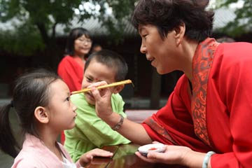 | 8月22日,一位老師在一名孩子的頭部點朱砂?!‘斎眨颖笔嬷菔羞\河區(qū)文廟社區(qū)為轄區(qū)孩子舉行“開筆禮”,26名即將升入小學的孩子在老師和家長帶領(lǐng)下,通過朱砂開智、擊鼓鳴志、開筆學字等環(huán)節(jié)感受中國傳統(tǒng)文化。新華社發(fā)(傅新春 攝)? |