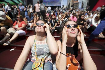 ?當?shù)貢r間8月21日,一次罕見的日全食景觀橫貫美國大陸,這是1918年以來首次發(fā)生僅在美國可見且美國東西兩岸皆可觀測的日全食。除此之外,在全食帶兩側(cè)數(shù)千千米的區(qū)域內(nèi)都能觀測到食分不等的日偏食。圖為人們在美國紐約時報廣場觀看日食。記者 王迎 攝 |