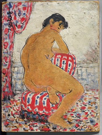 潘玉良的《窗前裸女》完成于1958年,為其二度赴法后的作品,這一年她曾榮獲比利時(shí)藝術(shù)金獎(jiǎng),并在塞努奇博物館舉辦大型個(gè)展,是其生活上較為寬裕,創(chuàng)作上高度成熟并廣受認(rèn)可的時(shí)期。她的意氣風(fēng)發(fā),亦體現(xiàn)在此作品明快的筆調(diào)與豐富的用色上。在作品的正面,她先以白描的技法勾勒出人物的造型、窗欞背景的布局,再施以鮮明的色彩。當(dāng)中的線條剛中見柔,干凈利落,亦如蔣仁所贊“緊勁連綿,意在筆先,畫盡意在,所以全神氣也”。當(dāng)中的女子雖背向而坐,但其身體語(yǔ)言沒有絲毫的扭捏,呈現(xiàn)一種開朗與自信。其曲線呈S型的延伸,打破了畫面的水平構(gòu)圖,帶來一種自然的動(dòng)感。回顧中國(guó)仕女畫的歷史起源,早在戰(zhàn)國(guó)、西漢時(shí)期的帛畫就已經(jīng)有婦女的形象,透過各個(gè)朝代的仕女畫,可見不同時(shí)期對(duì)女性美的向往。古人筆下的女子多半是體態(tài)輕盈、面容嫻靜的大家閨秀,但往往流于刻板。潘玉良豪邁的個(gè)性、身處于開放的巴黎,讓她畫下此大方、充滿生活味的女人,其豐碩的身材也流露了爽朗豁達(dá)的生命氣息。背景方面,從窗簾到地板,潘玉良吸收了印象派的點(diǎn)描法,但將之加以轉(zhuǎn)化為率性交錯(cuò)的個(gè)性化短筆,在撇、捺、交迭間增加了畫面上空間的層次,紅藍(lán)相間的色彩與橘紅混著鉛白在人們眼前飛舞,鋪陳出由窗外灑落、映照在地面上躍動(dòng)的春光,帶來溫暖的氣息。