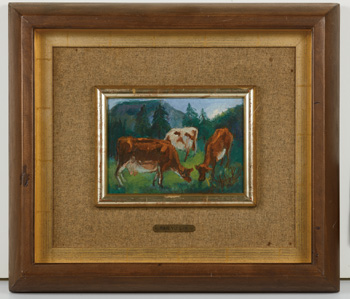 創(chuàng)作《山中群牛》此作時(shí),當(dāng)時(shí)的巴黎正被德軍占領(lǐng),市區(qū)淪陷,情勢(shì)緊張,潘玉良避居郊區(qū),看到在林中覓食的牛群,想起了在國(guó)內(nèi)的親人,當(dāng)時(shí)她經(jīng)濟(jì)狀況拮據(jù),以小尺幅的畫板,畫下此作,尺寸雖小,但方寸之間見其對(duì)空間的經(jīng)營(yíng)與主體的描繪毫不馬虎。畫幅中前中后三景分明,前景與中景處可見三只牛低頭吃草,兩大一小,其下筆老辣精準(zhǔn),在強(qiáng)而有力的撇捺轉(zhuǎn)折間,將動(dòng)物的飽滿強(qiáng)壯的身體結(jié)構(gòu)描繪出來,透過些微色調(diào)的變化與提亮,標(biāo)示了光線的軌跡與牛只脊谷,當(dāng)中毫無贅筆。而牛群被山林環(huán)繞,仿佛無憂無慮,與世無爭(zhēng)。潘玉良借著畫筆,若在創(chuàng)作中與海外的家人團(tuán)聚,在這里沒有戰(zhàn)火,沒有流言,只存純粹的寧?kù)o,柔和自在,展現(xiàn)了她心靈中的桃花源,賦予了此作超越表象的深度內(nèi)涵,別具意義。