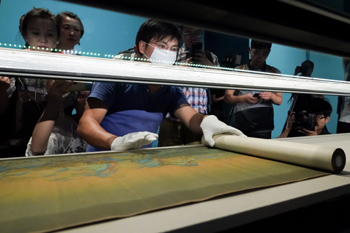 ??? 北京故宮博物院2017年的年度大展——《千里江山——?dú)v代青綠山水畫特展》9月15日在午門展廳和東西雁翅樓開展。展覽以北宋王希孟的《千里江山圖》為中心,系統(tǒng)梳理、展示中國(guó)歷代青綠山水畫的發(fā)展脈絡(luò)。圖為故宮博物院的工作人員將《千里江山圖》布置到展柜中。記者 沈伯韓 攝 |