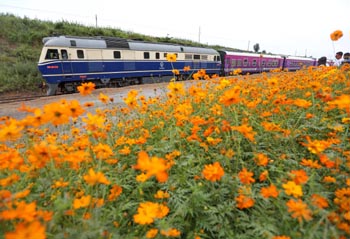 ??? 9月9日,河北秦皇島“秦旅山海號(hào)”旅游列車行駛在秦皇島市海港區(qū)杜莊鎮(zhèn)境內(nèi)的徐莊站附近。 當(dāng)日,“秦旅山海號(hào)”旅游列車在改造修建完工的山海旅游觀光鐵路上進(jìn)行運(yùn)行測(cè)試。列車最高時(shí)速為60km/h,共5節(jié)客車車廂,可同時(shí)容納436名乘客乘坐。據(jù)介紹,這條鐵路起自秦皇島港西港碼頭,終點(diǎn)為板廠峪景區(qū),全長(zhǎng)41.2公里,途經(jīng)代表著秦皇島歷史文化、工業(yè)發(fā)展、地質(zhì)特色的景區(qū),連山接海,沿途風(fēng)景美不勝收。記者 楊世堯 攝 |