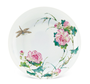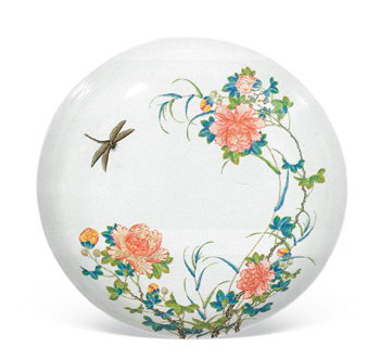 據(jù)清宮造辦處活計(jì)檔記載,雍正十年五月二十四日,“首領(lǐng)薩木哈持出畫琺瑯芙蓉四寸瓷碟一件,傳旨:照此碟尺寸,畫黑地白梅花四寸瓷碟一對(duì)?!眰魇狼鍖m御用琺瑯彩、粉彩瓷器上也屢見芙蓉圖樣。蜻蜓是詠春詩(shī)詞中常見的物象,劉禹錫的《春詞》“新妝宜面下朱樓,深鎖春光一院愁。行到中庭數(shù)花朵,蜻蜓飛上玉搔頭。”最為人稱道,但在繪畫和工藝品上遠(yuǎn)不如蛺蝶和象征多子的螽斯常見,可見清乾隆粉彩過(guò)枝芙蓉蜻蜓紋盤格外珍罕。其造辦處承做的皇家用器,每一件皆需經(jīng)過(guò)“呈核再做”的程序。制作前必先讓宮廷畫師繪出圖樣,經(jīng)胤禛批閱同意之后下發(fā)御窯廠燒造,其畫稿設(shè)計(jì)也必經(jīng)幾番修改。據(jù)考證,畫樣出自宮廷畫師蔣廷錫、鄒一桂之手,二者師出惲壽平門下,強(qiáng)調(diào)形準(zhǔn)風(fēng)格,其花鳥畫沿襲自南唐徐崇嗣的沒骨畫法,寫生寫意并重,設(shè)色秾麗,筆調(diào)雅逸。清秦祖永《桐陰論畫》評(píng)鄒一桂之花卉“用重粉點(diǎn)瓣。后以淡色籠染。粉質(zhì)凸出縑素上?!边@種用重粉營(yíng)造質(zhì)感,以淡色渲染的風(fēng)格,與我們所見這件清乾隆粉彩過(guò)枝芙蓉蜻蜓紋盤如出一轍。繪畫風(fēng)格來(lái)看,符合雍正皇帝的審美取向,也融入了雍正皇帝的鑒賞韻味。升平盛世天子雅好,宮廷畫師和御窯高手配合無(wú)間,最終成就了這件精雅美妙如寫生小品的粉彩珍瓷。