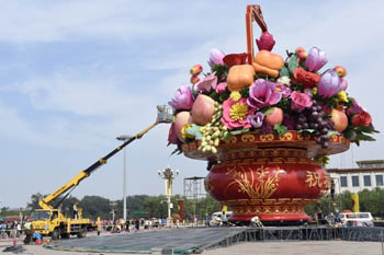 ??? 9月24日,工人在布置天安門廣場(chǎng)“祝福祖國(guó)”巨型花籃。當(dāng)日,天安門廣場(chǎng)“祝福祖國(guó)”巨型花籃基本布置完畢。今年的大花籃以喜慶的“花果籃”為主景,籃內(nèi)擺放柿子、石榴、蘋果及牡丹、玉蘭、月季等仿真花果,寓意十八大以來我國(guó)在各領(lǐng)域取得的輝煌成就。大花籃頂高17米、籃體高15.3米,底部花壇采用心形圖案,直徑達(dá)50米。籃體南側(cè)有“祝福祖國(guó),1949-2017”、北側(cè)有“喜迎十九大”字樣。從2011年開始,“祝福祖國(guó)”巨型花籃就一直作為廣場(chǎng)中心花壇,在國(guó)慶節(jié)期間向祖國(guó)獻(xiàn)禮。記者 羅曉光 攝 |