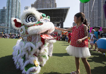 ??? 9月24日,在加拿大安大略省米西索加市,一名小女孩在“龍獅節(jié)”上與一只舞獅互動(dòng)。加拿大首屆“龍獅節(jié)”24日在米西索加舉行,有數(shù)十支舞龍和舞獅團(tuán)隊(duì)參加。新華社發(fā)(鄒崢 攝) |