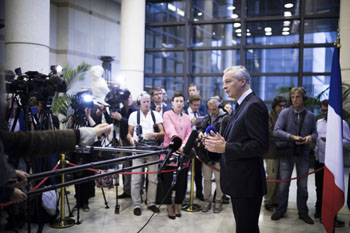 ??? 法國(guó)鐵路設(shè)備制造商阿爾斯通與德國(guó)西門子公司9月26日發(fā)表聯(lián)合公報(bào)說,兩家公司已就鐵路業(yè)務(wù)的合并達(dá)成協(xié)議。圖為法國(guó)經(jīng)濟(jì)部長(zhǎng)勒梅爾出席新聞發(fā)布會(huì)對(duì)合并表示支持。新華社/美聯(lián) |