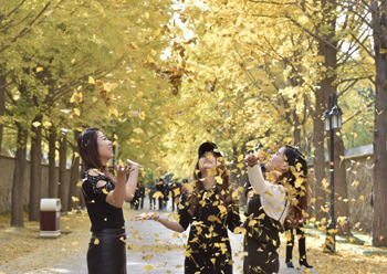 ??? 10月31日,游客在圓明園銀杏大道游玩。北京圓明園內(nèi)有一條近千米的銀杏大道,目前已進(jìn)入最佳觀賞期,黃燦燦的銀杏葉和兩側(cè)圍墻上紅色的藤蔓相互映襯,美不勝收,吸引游客前來觀賞。記者 羅曉光 攝 |